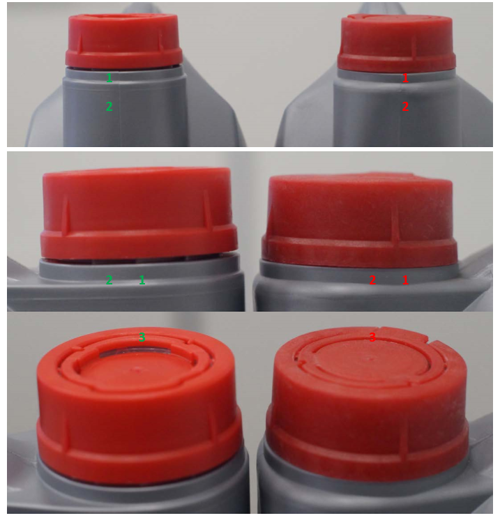 1) На оригинале крышка плотно подогнана, строго горизонтально к плоскости горлышка, но подделке крышка не плотна, возможны перекосы от горизонтали по отношению к горлышку канистры.