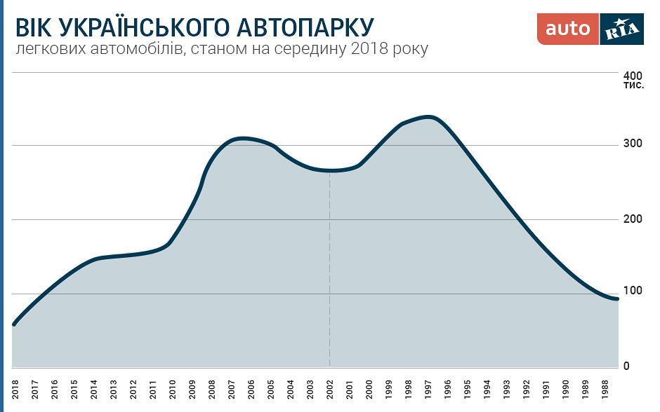Одна з вершин графіка, схожого на капелюха (чи то удава, який ковтнув слона) припадає на 2007-2008 роки. Не дивина: кредитний бум, «долар по 5», ще живе місцеве автовиробництво... Наступна вершина — біля 1997 року, про ці часи вже можна складати байки і легенди: чого лише вартий фольклор «долар по 2 гривні»… Автомобілів віком до 5 років небагато – після початку кризи 2014-го імпорт нових легківок не перевищував показника 100 тисяч на рік. Принаймні, поки що.