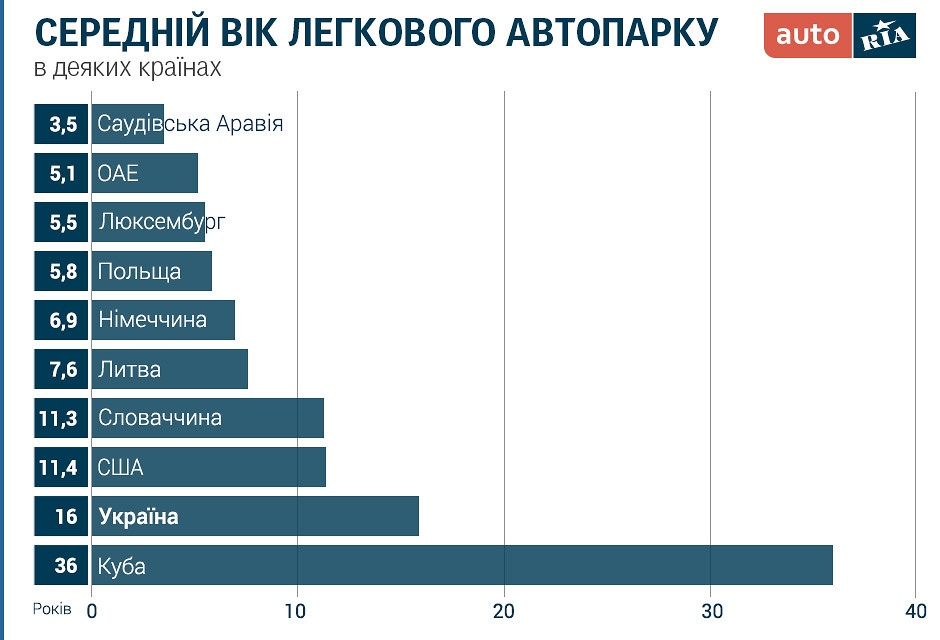 Отже, після розрахунків так звана медіана зупинилась на позначці 2002-го року випуску: це значить, що середній вік легкового транспорту в Україні становить близько 16 років. Це доволі непогана позиція, особливо на фоні того, що у численних публічних дискусіях опоненти більш охоче наводять значення «приблизно 20 років». А що робиться у світі... ну і, власне, як там на Кубі? Замість тисячі слів, давайте розглянемо інфографіку, та порівняємо показник України з деякими іншими: