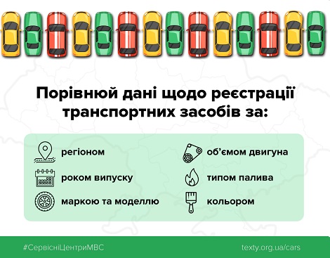 «Головний сервісний центр МВС відкрив дані про реєстрацію транспортних засобів в Україні - відтепер можливо дослідити реальний стан українського авторинку за онлайн-сервісом texty.org.ua/cars. Доступ до інформації – запорука довіри до державних інституцій", - наголосив Арсен Аваков.