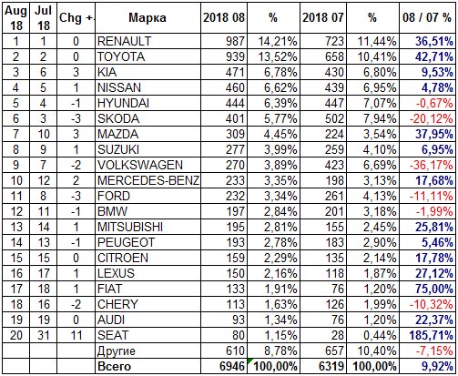 В итоге, в продажах в августе прибавили многие бренды. Но позиционная борьба тоже происходила. Так. Первое место удержала Renault, чьи позиции продолжает атаковать Toyota. Именно японской марке принадлежит рекорд по самому динамичному росту в августе в Топ-10. В августе на 3-е место по рынку вышли дилеры KIA. Им удалось обойти сразу 3-х конкурентов даже увеличив реализацию чуть меньше общего роста на рынке. Следом по той же тактике улучшил свои позиции и Nissan.