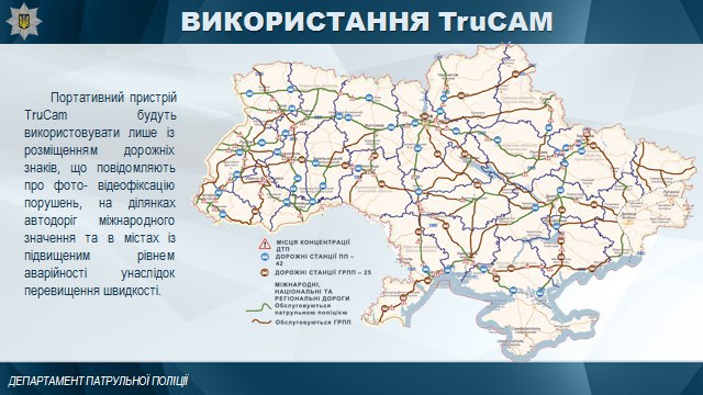 Патрульна поліція буде використовувати TruCam виключно на ділянках автодоріг із дорожніми знаками, що повідомляють про фото- відео фіксування порушень, з підвищеним рівнем аварійності, пов’язаним з перевищенням швидкості, як у містах так і на дорогах міжнародного значення.