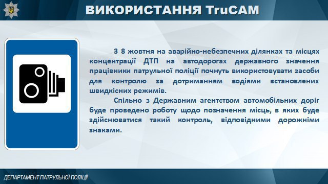 В Україні з 8 жовтня 2018 року в місцях концентрації ДТП та на аварійно-небезпечних ділянках доріг міжнародного значення патрульні поліцейські почнуть використовувати засоби для контролю за дотриманням водіями встановлених швидкісних режимів – портативні пристрої вимірювання швидкості TruCam.
