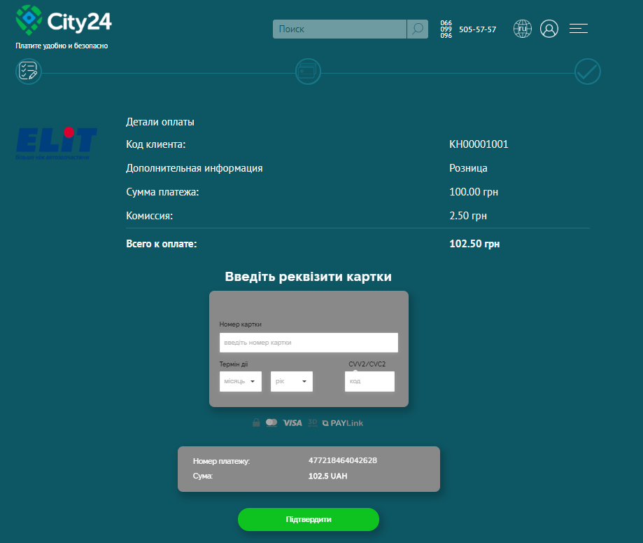 После нажатия кнопки далее Вы попадаете на страницу, где необходимо ввести данные Вашей банковской карты и подтвердить платеж. Если у Вас на карте настроена двухфакторная авторизация, то понадобится еще ввести код из SMS от банка.
