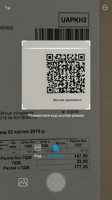 1. За допомогою вбудованого або завантаженого додатку необхідно зчитати QR код, який розташований у правому верхньому кутку на кожній видатковій накладній. Цей код є динамічним, так як у ньому міститься інформація щодо коду клієнта та сума сплати по цій накладній.