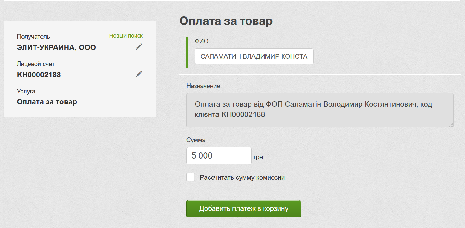 - Вносимо суму оплати, додаєм платіж у кошик та підтверджуємо його.
