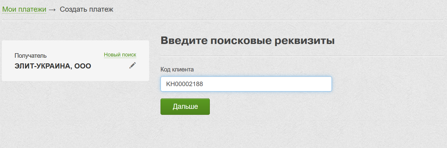 - На наступному екрані уважно вводимо свій код клієнта і натискаємо кнопку «Далі». За цим кодом відбувається аутентифікація з нашою програмою і Ваш код клієнта і його назва в системі автоматично підставляється в призначення платежу.