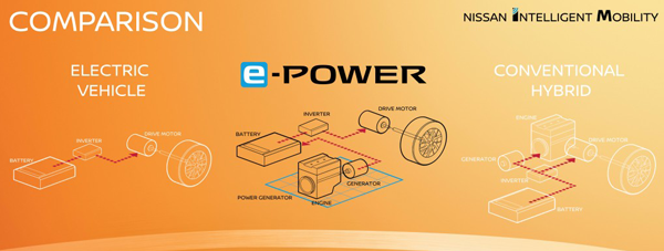 Трансмісія e-Power по суті робить машину електромобілем, тому що акумулятор в ній заряджається на ходу внаслідок комбінації рекуперації енергії та невеликого двигуна внутрішнього згоряння, який служить виключно як генератор. Електроенергія, що виробляється ДВЗ, також може безпосередньо приводити в дію електродвигун транспортного засобу в умовах високого навантаження.
