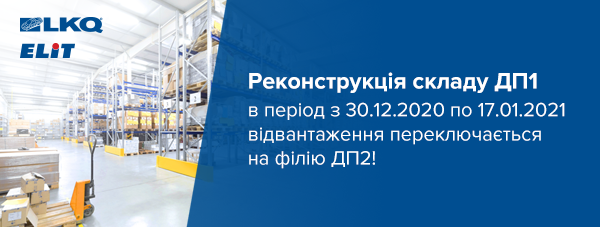 У зв'язку з оптимізацією площі складу філії "Дніпро-1", відвантаження товару клієнтам призупинено в період з 30.12.2020 до 17.01.2020 включно. В даний період товар відвантажуватиметься з філії "Дніпро-2". Враховуйте, будь ласка, подовжений період доставки в даний період.