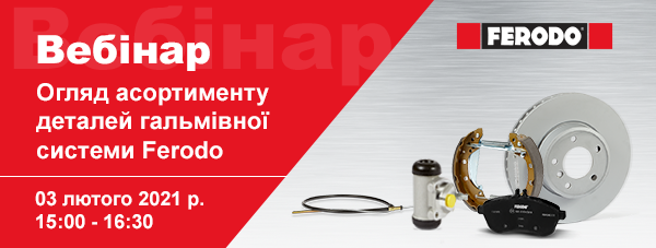 Повідомляемо Вам, що 03 лютого о 15:00 розпочнеться вебінар на тему: "Огляд асортименту деталей гальмівної системи Ferodo ". На вебінарі буде розглянута наступна інформація: