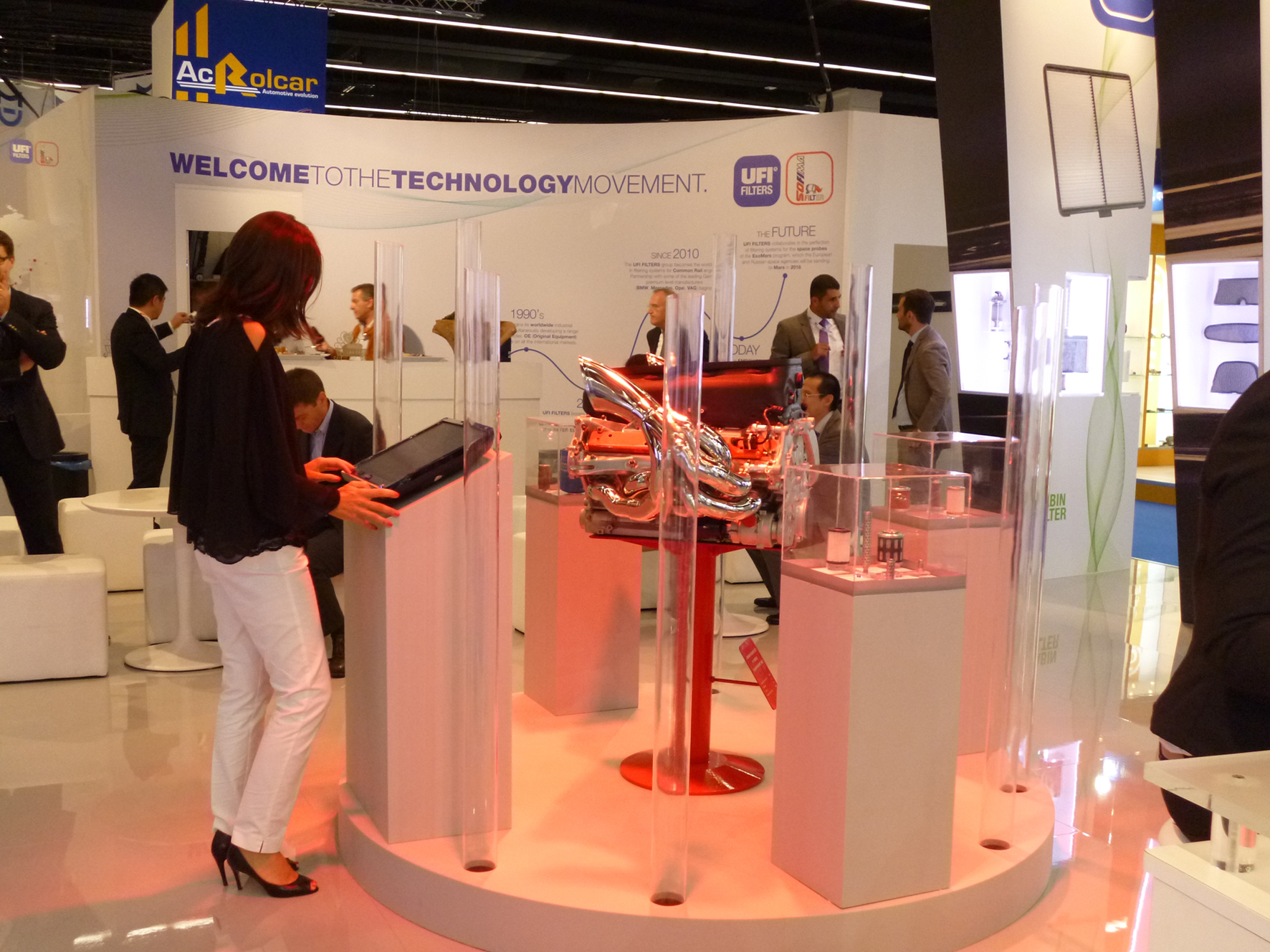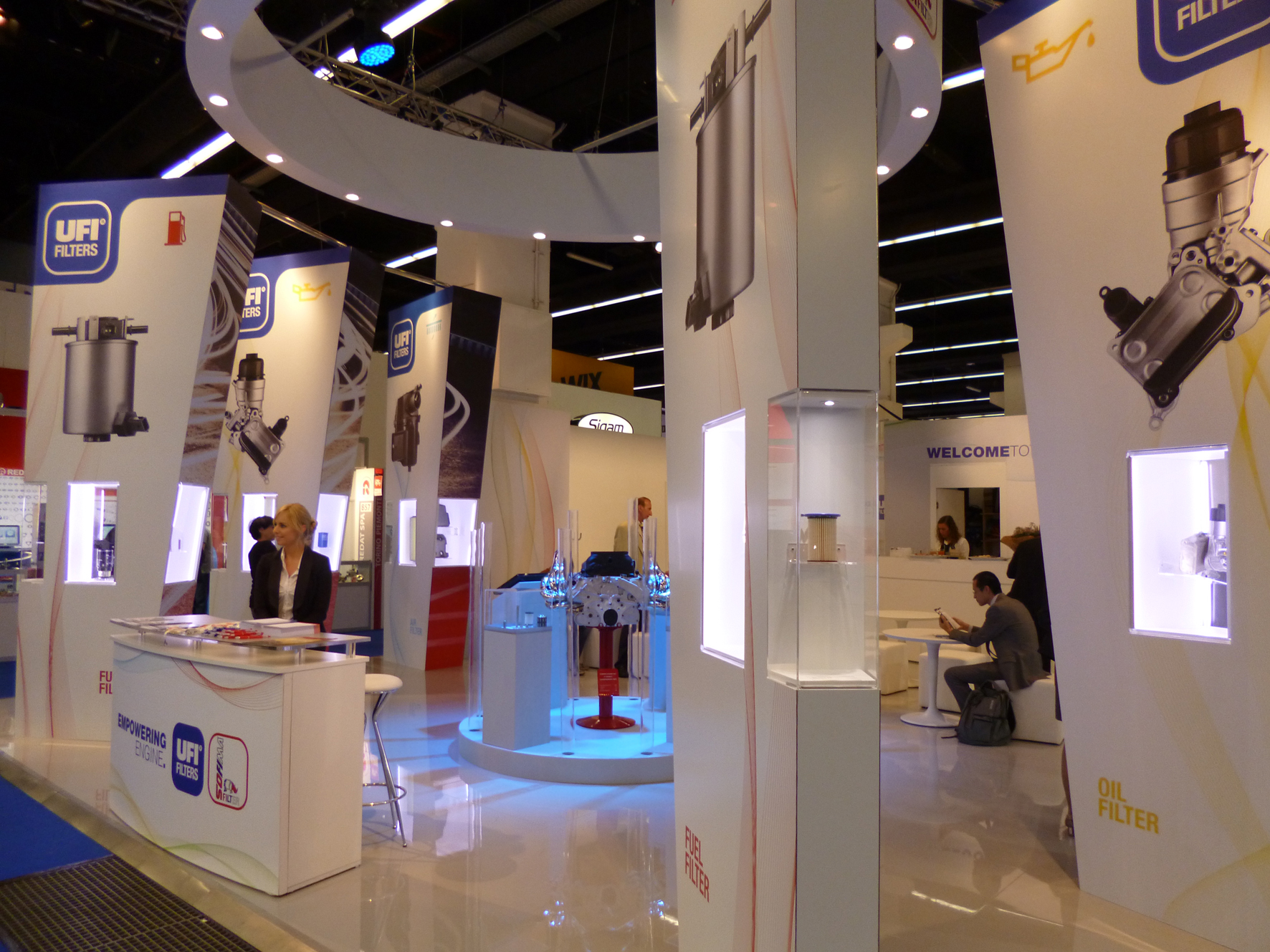 Стенд UFI был действительно впечатляющим! Овальное пространство по форм-фактору походило на фильтрующий элемент. Семь лопастей разделяли стенд, и выделяли отдельные продукты. Визуально стенд был разделен на четыре цвета, каждый из которых базовых элементов с типом фильтров. Красный символизировал огонь, характеризующий топливную систему. Желтый – это символ земли, показывающий, чистоту масла после фильтрации. Синий – это вода, символизирующее воздушные фильтры, зеленый же соответствовал салонным фильтрам.